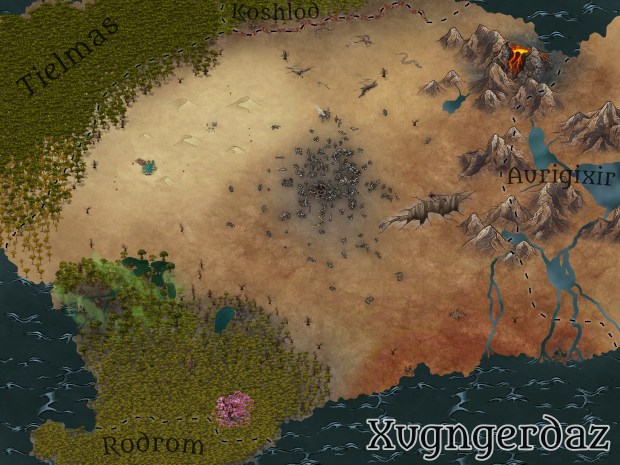 Amongst all the lands to be found within the world of Adetrom, Xugngerdaz is undoubtedly the most mysterious. The region is scorched and ravaged, barren and debased, with echoes of its past jutting out from the weeping sands and rusty junkyards. Monstrosities lie in wait beneath Xugngerdaz’s demented cliffs and enshrouded mires, and the land’s climate is burdened by exigent curse.